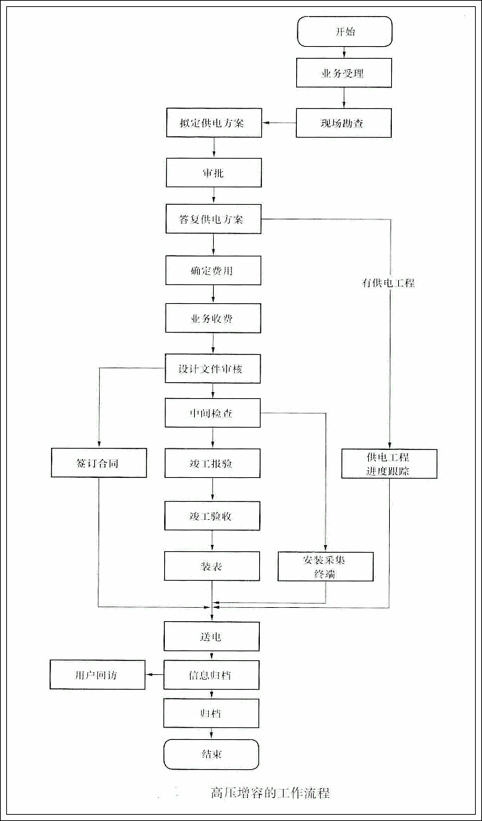 2.供電企業(yè)依據(jù)《供電營業(yè)規(guī)則》有關(guān)用電報(bào)裝的條款規(guī)定、國網(wǎng)公司統(tǒng)一發(fā)布的服務(wù)承諾及服務(wù)規(guī)范,在一定的時(shí)限內(nèi),為用電設(shè)備容量在100kW及以上或變壓器容量在50kWh以上(特殊情況下,容量范圍可適當(dāng)放寬)用戶的用電增容申請,組織現(xiàn)場勘査,制定10kV及以上電壓等級供電方案,向用戶收取有關(guān)營業(yè)費(fèi)用,跟蹤供電工程的立項(xiàng)、設(shè)計(jì)圖紙審查、工程預(yù)算、設(shè)備供應(yīng)、施工過程,組織受電工程的圖紙審查、中間檢查、竣工驗(yàn)收,與用戶簽訂供用電合同,并給予裝表送電,完成資料歸檔全過程管理。