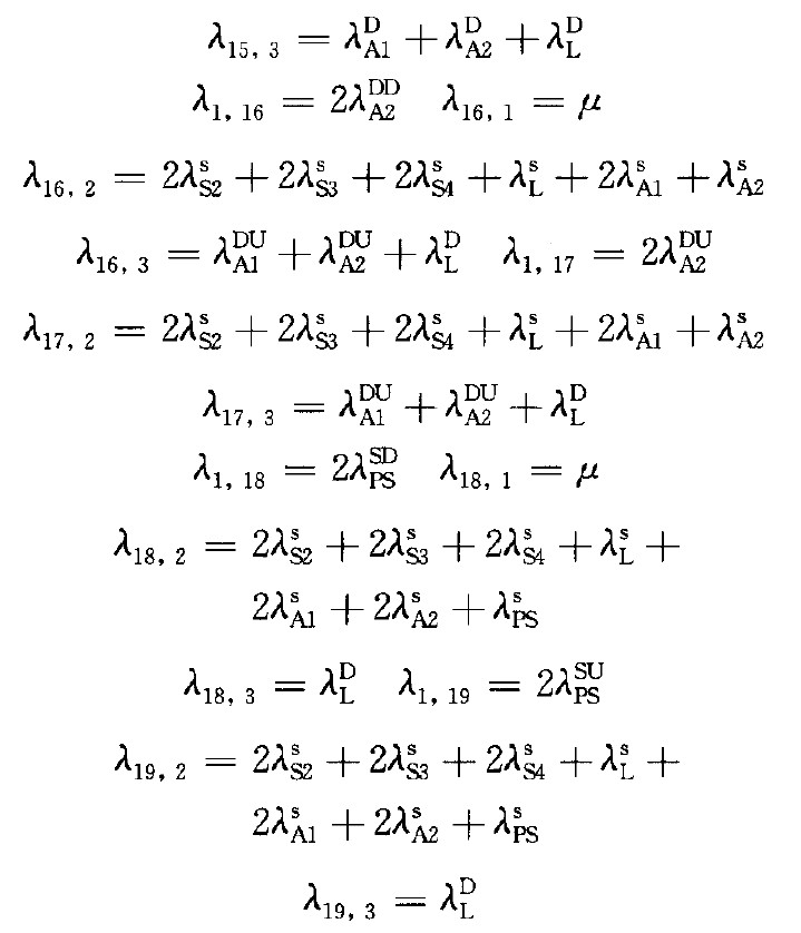 MTTFS求解方法[8]為將轉移矩陣P中對應吸收狀態(tài)(FS和FD)的行和列去掉,形成新矩陣Q,并在狀態(tài)轉移率公式中,將危險失效率置零,求出截陣Qs ,并依據下式求矩陣N。