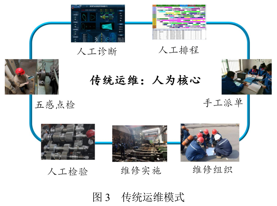 RCM、 RkBM、 ACM 和 TPM 等均屬于傳統(tǒng)運(yùn)維模式。 寶鋼的設(shè)備管理模式是以點(diǎn)檢定修制為組織形式, 以預(yù)防維修為主線, 通過狀態(tài)管理逐步實(shí)現(xiàn)維修內(nèi)容的狀態(tài)性導(dǎo)向, 實(shí)行強(qiáng)化設(shè)備管理基礎(chǔ)維護(hù)的 TPM 管理模式, 在維修的策略上則是以經(jīng)濟(jì)效益為中心的多種維修方式并存 [1] , 屬于傳統(tǒng)運(yùn)維的范疇。 傳統(tǒng)運(yùn)維模式流程如圖 3 所示, 首先由維護(hù)人員進(jìn)行五感點(diǎn)檢, 專家再對(duì)異常場景進(jìn)行人工診斷, 根據(jù)診斷結(jié)果進(jìn)行人工排程和手工派單, 再由運(yùn)維團(tuán)隊(duì)進(jìn)行維修方案制定和維修實(shí)施, 最后由人工進(jìn)行檢查驗(yàn)收。 傳統(tǒng)運(yùn)維模式以“人為核心”, 也即以提升人的能力為核心, 通過運(yùn)維閉環(huán)迭代不斷提升員工的技術(shù)能力和管理能力。 傳統(tǒng)運(yùn)維模式的最大挑戰(zhàn)是運(yùn)維質(zhì)量與人的水平相關(guān)。 人的能力、 態(tài)度、情緒和狀態(tài)直接影響運(yùn)維工作質(zhì)量。 另外, 人員的離職、 升遷、 退休和調(diào)崗都將影響相關(guān)運(yùn)維工作。